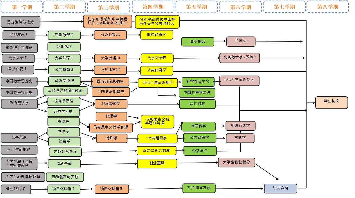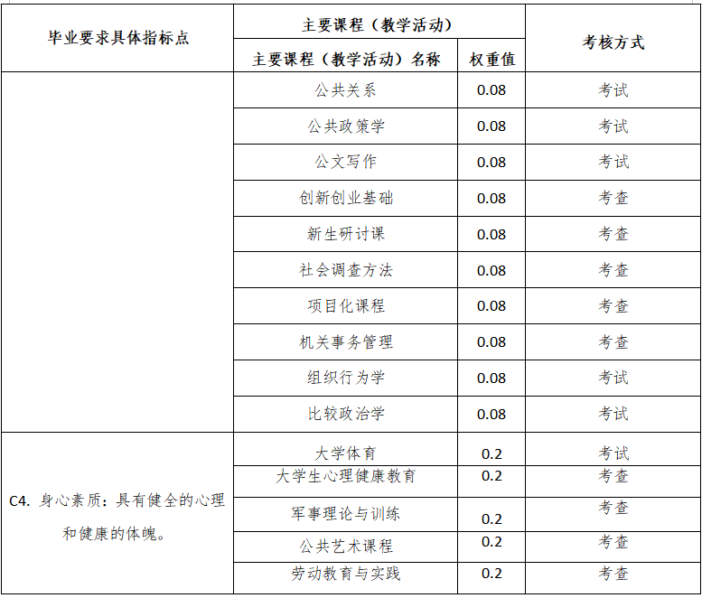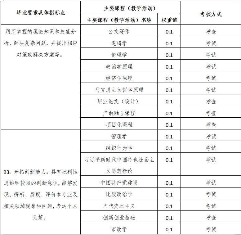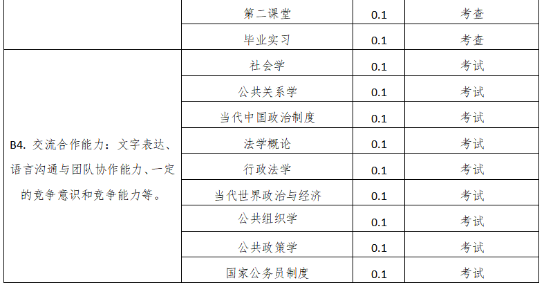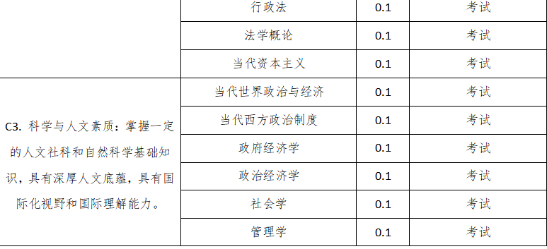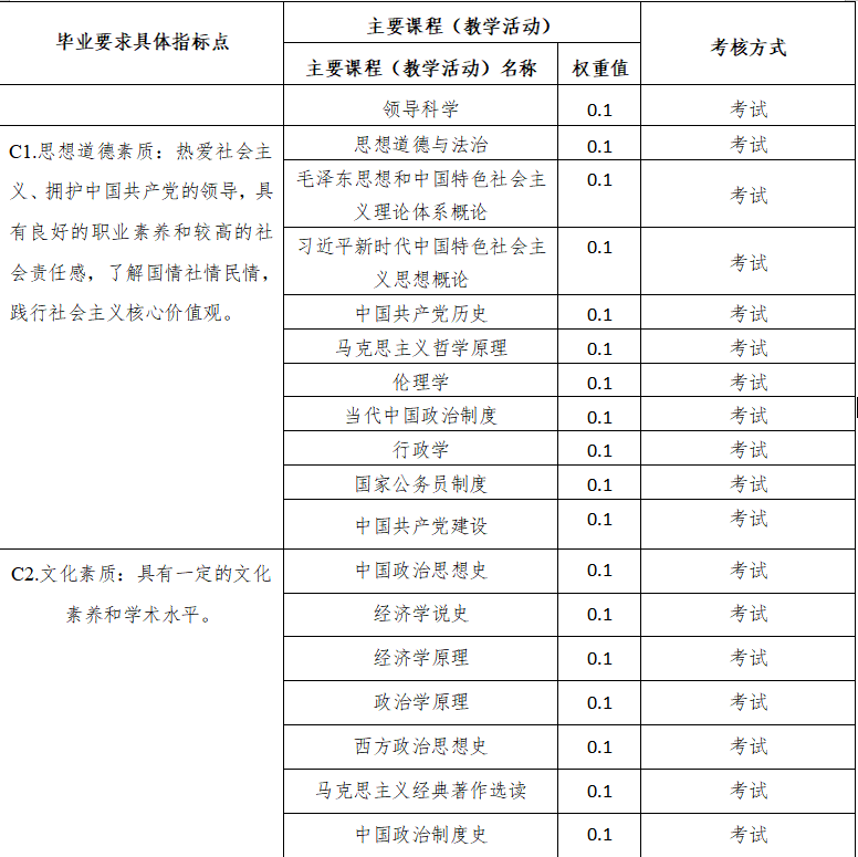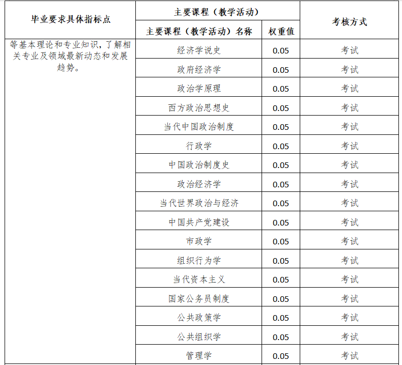 2)專業(yè)教育課程:包括專業(yè)必修課程、專業(yè)選修(方向)課程與專業(yè)任選課。其中,專業(yè)必修課程包括學(xué)科基礎(chǔ)課與專業(yè)核心課,主要有“政治學(xué)原理、中國共產(chǎn)黨歷史、馬克思主義哲學(xué)原理、中國政治思想史、經(jīng)濟(jì)學(xué)原理、經(jīng)濟(jì)學(xué)說史、社會(huì)學(xué)、中國政治制度史、行政學(xué)、公共組織學(xué)、政治經(jīng)濟(jì)學(xué)、政府經(jīng)濟(jì)學(xué)、邏輯學(xué)、馬克思主義哲學(xué)原著導(dǎo)讀、當(dāng)代中國政治制度、西方政治思想史、當(dāng)代世界政治與經(jīng)濟(jì)、倫理學(xué)、公共關(guān)系學(xué)”。