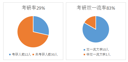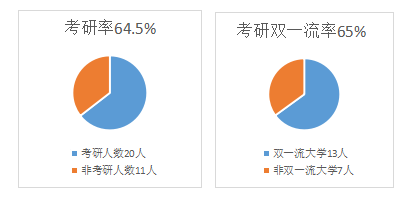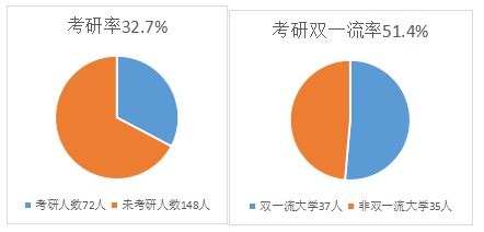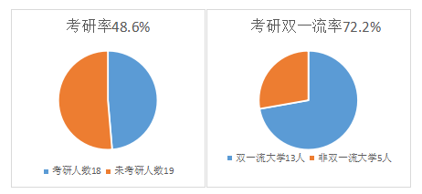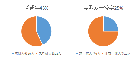考研情況介紹:偉德betvlctor體育官網(wǎng)2017級(jí)畢業(yè)生共220人,其中171人報(bào)考研究生,報(bào)考率為77.7%,72人成功上岸,升學(xué)率為32.7%,其中考取雙一流院校37人,非雙一流院校35人,雙一流率51.4%,今年升學(xué)率較往常相比有所下降,但整體變化不大,雙一流率仍然過(guò)半,其中有兩名同學(xué)成功保研,具體情況如下: