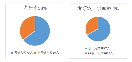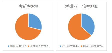 7班有本科生35人,35人中共29人報(bào)考研究生,報(bào)考率為83%,17人成功上岸,升學(xué)率為48.5 %,考研雙一流率為28.5%,升學(xué)率和雙一流率在三個(gè)班中排名第一。在17位考取研究生的同學(xué)中,有6位同學(xué)選擇南方城市,剩余11位同學(xué)選擇北方以及西北城市;考取雙一流院校的10位同學(xué)中,都是在一級(jí)學(xué)科之內(nèi)進(jìn)行報(bào)考。
