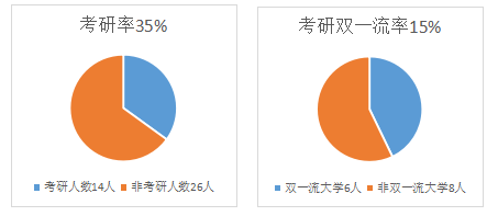 5班有本科生40人,40人中共33人報(bào)考研究生,報(bào)考率為82.5%,14人成功上岸,升學(xué)率為35%,考研雙一流率為15%;在14位考取研究生的同學(xué)中,有2位同學(xué)選擇南方城市,剩余12位同學(xué)選擇北方以及東北城市;考取雙一流院校的6位同學(xué)中,都是在一級(jí)學(xué)科之內(nèi)進(jìn)行報(bào)考。