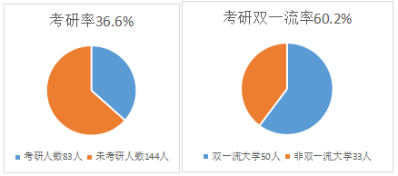 考研情況介紹:偉德betvlctor體育官網(wǎng)2016級(jí)畢業(yè)生共227人,其中195人報(bào)考研究生,報(bào)考率為85.9%,83人成功上岸,升學(xué)率為36.6%,其中考取雙一流院校50人,非雙一流院校33人,雙一流率60.2%,幾乎所有學(xué)生均選擇考研,且升學(xué)率超過(guò)三分之一,雙一流率再創(chuàng)新高,具體情況如下: