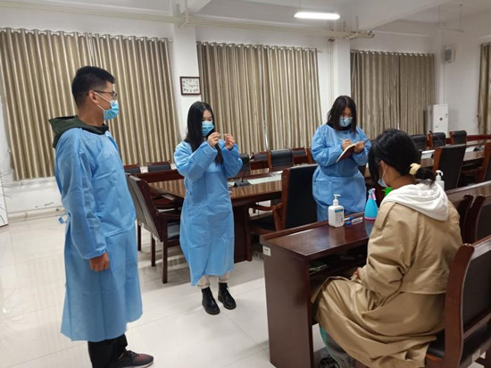 演練現(xiàn)場(chǎng),“班級(jí)負(fù)責(zé)人”“學(xué)院聯(lián)絡(luò)員”“值班醫(yī)生”“輔導(dǎo)員”“黨總支書(shū)記”之間的溝通及實(shí)操,學(xué)生演員們向觀摩人員展示了學(xué)生在宿舍及教室區(qū)域出現(xiàn)身體異常,應(yīng)如何正確處理,如何做到“及時(shí)上報(bào)—冷靜處理—高效就診—科學(xué)消殺”。