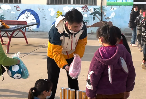 (劉新宇為學(xué)生發(fā)放體育用品)