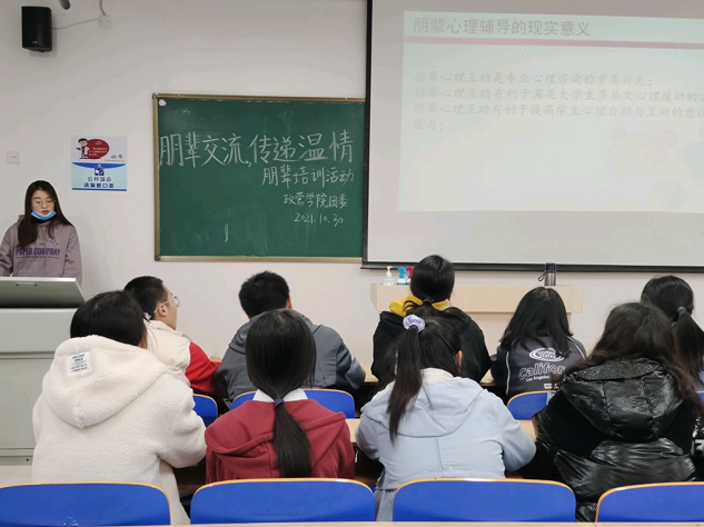 為使2021級大學(xué)生朋輩心理輔導(dǎo)員了解心理工作內(nèi)容,加強(qiáng)我院朋輩心理輔導(dǎo)員的隊(duì)伍建設(shè),落實(shí)學(xué)院的各項(xiàng)心理工作,10月30日,偉德betvlctor體育官網(wǎng)于東校區(qū)6#A203舉辦“朋輩交流,傳遞溫情”朋輩交流培訓(xùn)活動。