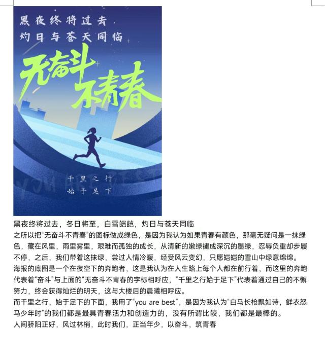 本次比賽的主題為“心理健康”教育。比賽要求參賽者從自身角度出發(fā),通過設(shè)計創(chuàng)意海報,傳遞心理健康的重要性。評選過程嚴格公正,評委們從海報的創(chuàng)意、設(shè)計、文字、色彩等方面綜合考慮,最終評選出了一、二、三等獎各若干名及優(yōu)秀獎等特別獎項。在比賽中,很多參賽者都表現(xiàn)出了出色的創(chuàng)意和設(shè)計能力,他們的作品不僅傳達了心理健康的重要性,還展現(xiàn)了他們自身的特點和風格,彰顯出參賽者高超的繪畫和設(shè)計技術(shù)。其中的一些作品通過簡單明了的文字和圖形,如“用心呵護心”、“拒絕焦慮”等標語向觀眾傳遞了深刻的心理學知識,展現(xiàn)了參賽者知識儲備的淵博。在作品鑒賞和討論環(huán)節(jié),王舒心同學的作品將“無奮斗不青春”的圖標做成綠色,她認為青春的顏色是綠色,從清新的嫩綠褪成深沉的墨綠,表示青年褪去稚嫩的身影一步步走向成熟。