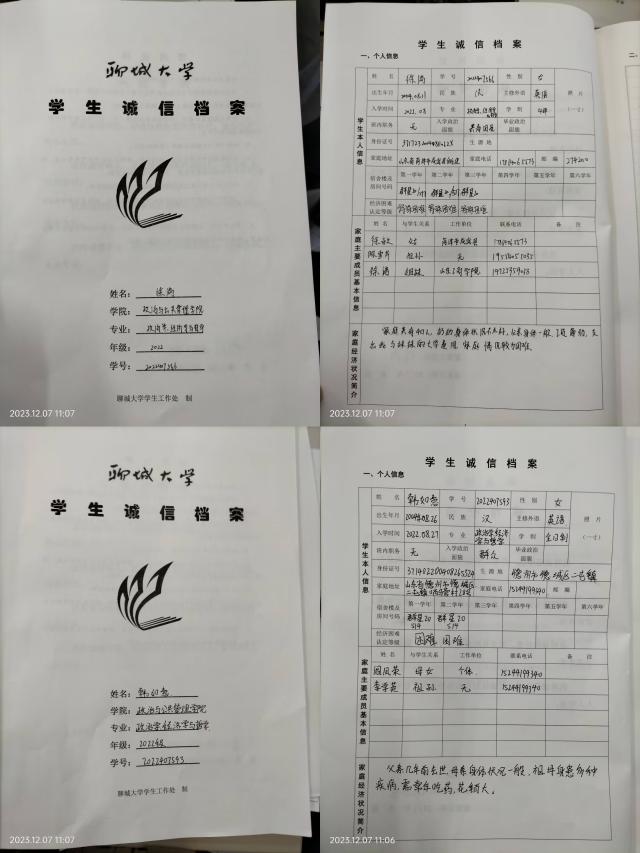 此次學(xué)生誠信檔案的建立主要包括三個方面的內(nèi)容:誠信檔案內(nèi)容的確立,學(xué)生各類資料的獲得、分析以及對學(xué)生的信用評估。負責(zé)人為每一名同學(xué)發(fā)放誠信檔案表使其自主填寫相關(guān)信息,學(xué)校留作存檔,并采集匯總了電子版,記錄學(xué)生在大學(xué)生活的誠信信息。誠信檔案主要包括學(xué)習(xí)是否誠信、經(jīng)濟是否誠信、生活品行是否誠信以及大學(xué)生個人承諾書。誠信檔案反映了誠信主體在社會生活的各方面誠實守信程度的歷史記錄,涵蓋經(jīng)濟領(lǐng)域的信用程度記錄、道德品質(zhì)減實狀況和政治思想文明情況,并在學(xué)生思想政治工作和管理工作中發(fā)揮重要作用。學(xué)生在建立檔案的第一時間承諾、簽字。