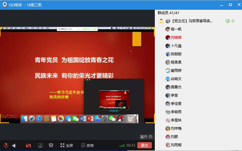 2020年3月17日上午,在劉琳琳老師的帶領(lǐng)下2018級3班所有同學(xué)在線共同學(xué)習(xí)了習(xí)近平總書記給北京大學(xué)援鄂醫(yī)療隊全體“90后”黨員的回信。
