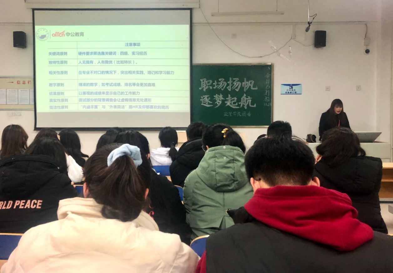 為加強大學生對當前就業(yè)形勢的了解,明確就業(yè)目標,提高大家就業(yè)技能,同時使同學們充分認識自我,樹立競爭性的擇業(yè)觀,做好就業(yè)決策及就業(yè)準備,11月25日,我院于東校區(qū)6#c301開展“職場飛揚,逐夢未來”中公教育就業(yè)講座活動。