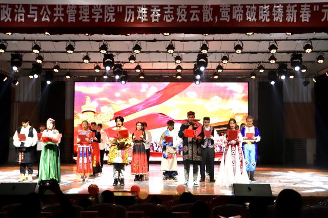 晚會共分為“乘風破浪守新正”、“一心移疫迎新春”、“秣馬揚帆筑新夢”三個篇章,涵蓋了歌曲、舞蹈、小品、朗誦等文藝節(jié)目。學生們動聽誠摯的歌曲、熱情奔放的舞蹈、激情昂揚的朗誦、歡樂感人的小品展現(xiàn)著青年風采與活力,訴說著對新年的向往,活躍現(xiàn)場氛圍?!洞篝~》、《春暖花開》等歌曲體現(xiàn)了青年學子的文藝素養(yǎng),《蘇幕遮》、《Young Forever》展現(xiàn)著大學生的活力與魅力,《最美逆行者》、《烏龍快遞》在幽默風趣的表演下表達出對抗疫醫(yī)護人員的崇敬與感激,合唱《多彩青春》歌唱出青年學子的精神風貌與責任擔當,舞蹈《心隨影動,筑夢未來》以極具創(chuàng)意的表演形式演示出對祖國富強的自豪和對新春的祝賀,由各少數(shù)民族學生帶來的朗誦激情昂揚、富有感情,誦讀出各民族的團結(jié)友愛和對祖國深深的熱愛之情。老師們也走上舞臺,與同學聯(lián)袂出演舞蹈《紅棗樹》默契的配合、優(yōu)美的舞步充分展現(xiàn)出了師生間的融洽關系,讓全場氛圍沸騰起來,于進的《同桌的你》感情真摯,優(yōu)美動聽,令全場觀眾再次體會到那青蔥歲月的青澀與美好,《執(zhí)黨旗指引,吟中華史詩》吟誦出堅決聽黨指揮,努力奮斗的決心與魄力。晚會在合唱《少年》結(jié)束后落下帷幕。