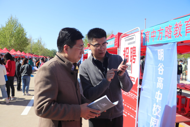 風起云涌,人人出動。此次雙選會暨招聘會共284家企業(yè)、學校參加,涵蓋地方中小學、教育科技企業(yè)等各種不同性質(zhì)的單位。莊波、明輝首先對前來的各單位進行了簡單的了解,詢問了關(guān)于招聘要求、薪資待遇、工作環(huán)境等一系列與畢業(yè)生利益切身相關(guān)的問題,同時與招聘負責人進行交流,更加充分地了解到畢業(yè)生尤其是我院師范類畢業(yè)生可以選擇的工作崗位類型和待遇,對目前的畢業(yè)生就業(yè)形勢與就業(yè)市場有了更加清晰的認識。其中,在參觀到育中方略教育集團招聘位時,莊波、明輝結(jié)合我院專業(yè)及我院畢業(yè)生現(xiàn)狀與負責人進行了深入交流。應(yīng)屆畢業(yè)生趙琰、王建偉結(jié)合自身條件及該企業(yè)的招聘要求與負責人進行交流,針對畢業(yè)后的就業(yè)需求,有選擇性的對一些意向崗位進行深入了解,收獲頗豐。