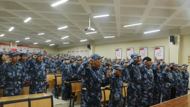 青春學(xué)子步履昂揚(yáng),目光并向黨旗東方。同學(xué)們身著軍裝,展示出青年的意氣風(fēng)發(fā)、英姿颯爽。在主持人一聲號令下,全體成員起立,面對鮮艷的團(tuán)旗,右手握拳,手舉過肩,以最宏亮的聲音進(jìn)行莊嚴(yán)宣誓,同學(xué)們的話語鏗鏘有力、充滿激情,充分體現(xiàn)出作為共青團(tuán)員的精神風(fēng)貌。激昂的宣誓過程中,同學(xué)們用誓詞表達(dá)了對共產(chǎn)主義青年團(tuán)組織的無限向往和為團(tuán)組織增光添彩的豪邁激情。團(tuán)員代表李子川號召同學(xué)們從現(xiàn)在開始,要在各個(gè)方面嚴(yán)格要求自身,認(rèn)真履行團(tuán)員義務(wù),堅(jiān)定理想信念,牢記入團(tuán)誓詞,爭做優(yōu)秀團(tuán)員。同學(xué)們也紛紛表示會在生活與學(xué)習(xí)中貫徹落實(shí)團(tuán)員誓詞的要求,用良好的一言一行踐行誓詞,團(tuán)結(jié)奮進(jìn)、銳意進(jìn)取,承擔(dān)起自身擔(dān)負(fù)的社會責(zé)任,不負(fù)黨和人民的期許。