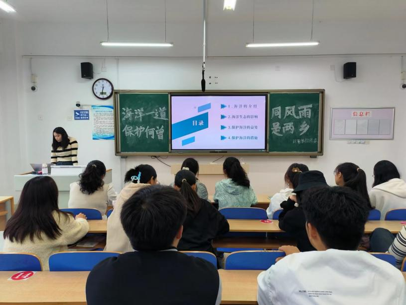 活動負(fù)責(zé)人以日本排放核污水導(dǎo)致的后果為切入點(diǎn),引出人類活動對海洋的破壞性及海洋對人類的反噬作用,讓同學(xué)們認(rèn)識到保護(hù)海洋的重要性和急迫性。負(fù)責(zé)人通過視頻、圖片和文字相結(jié)合的方式向同學(xué)們講解相關(guān)的海洋知識,進(jìn)一步增加同學(xué)們對海洋的作用及人類對海洋的依賴程度的了解,讓同學(xué)們深刻的領(lǐng)悟到保護(hù)海洋的重要性以及人與自然和諧共生的意義。負(fù)責(zé)人演講結(jié)束后,積極組織參與者設(shè)計(jì)保護(hù)海洋的宣傳標(biāo)語,并邀請大家上臺分享設(shè)計(jì)理念,參與者郭冉分享宣傳標(biāo)語“藍(lán)色海洋,綠色行動”,借用“綠色”呼吁大家采取環(huán)保行動來保護(hù)海洋,激發(fā)同學(xué)們對保護(hù)海洋行動的熱情。負(fù)責(zé)人鼓勵(lì)參與者發(fā)表對本次活動的感悟和看法,參與者安亞楠表示,我們應(yīng)該采取行動減少海洋污染,進(jìn)而減少對海洋生物的傷害,保護(hù)海洋,人人有責(zé)。活動負(fù)責(zé)人對本次活動進(jìn)行總結(jié),呼吁大家一起行動,提高環(huán)保意識,共同努力讓海洋更藍(lán)。