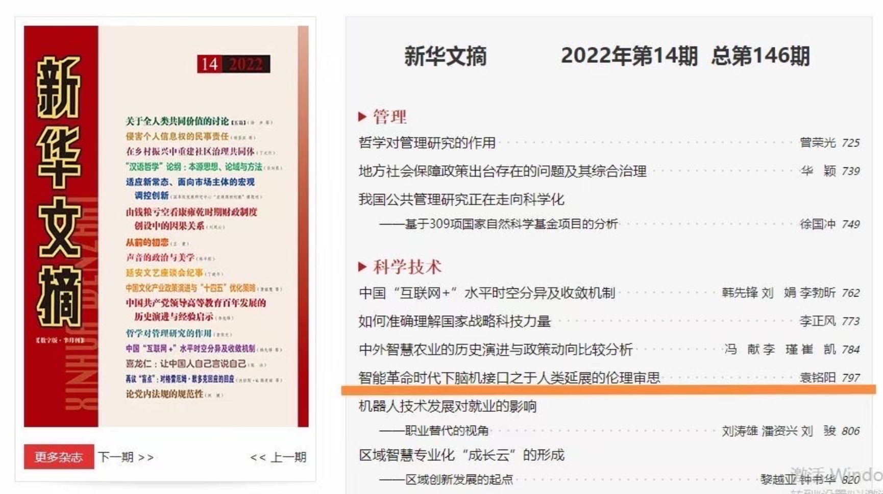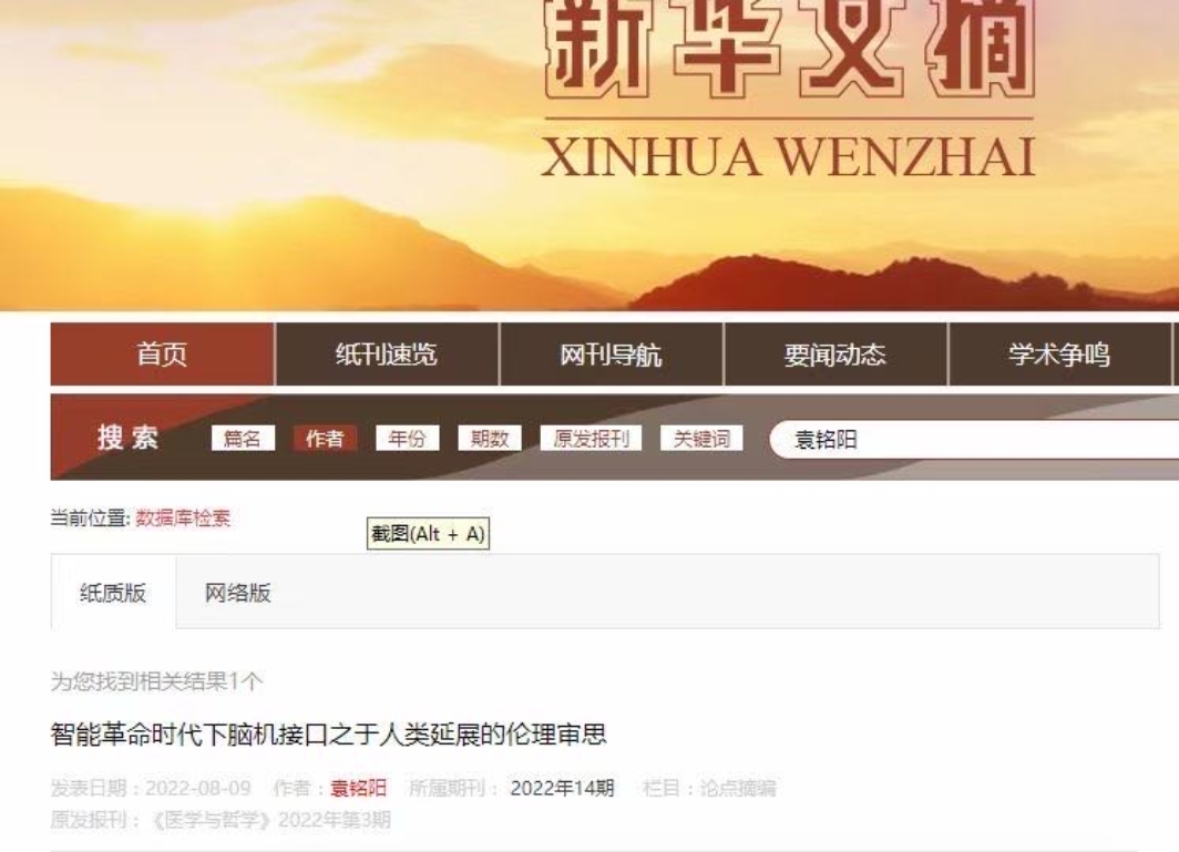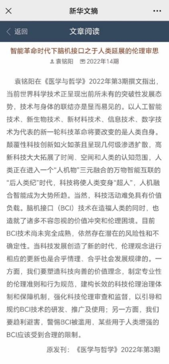 偉德betvlctor體育官網(wǎng)2015屆本科畢業(yè)生袁銘陽,博士就讀于山西大學(xué)科學(xué)技術(shù)哲學(xué)研究中心并獲得哲學(xué)博士學(xué)位。該同學(xué)于讀博期間在《醫(yī)學(xué)與哲學(xué)》2022年第3期發(fā)表的學(xué)術(shù)論文《智能革命時(shí)代下腦機(jī)接口之于人類延展的倫理審思》,被《新華文摘》(紙質(zhì)版2022年第14 期論點(diǎn)摘編,同時(shí)被《新華文摘》數(shù)字版2022年第14期科學(xué)技術(shù)欄目全文轉(zhuǎn)載。
