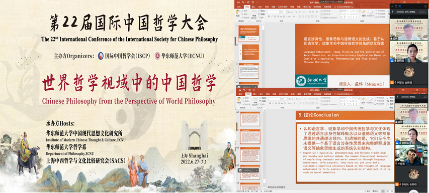 第22屆國際中國哲學(xué)大會“世界哲學(xué)視域中的中國哲學(xué)”(Chinese Philosophy from the Perspective of World Philosophy——The 22nd International Conference of the ISCP)在2022年6月27日至7月1日在中國上海召開。本次會議由國際中國哲學(xué)會、華東師范大學(xué)主辦,華東師范大學(xué)中國現(xiàn)代思想文化研究所、華東師范大學(xué)哲學(xué)系承辦,上海中西哲學(xué)與文化比較研究會協(xié)辦。會議采取線上會議形式舉辦。