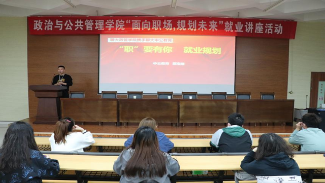 邵寶緒以報考公務(wù)員、考研、報考教師編以及就業(yè)四條道路的選擇為主題展開此次活動,從就業(yè)大形勢、就業(yè)好選擇和答疑解惑三個方面進行講解。著重分析了高校畢業(yè)人數(shù)持續(xù)增長但用人單位人員需求量飽和的就業(yè)嚴峻現(xiàn)狀,使同學們對就業(yè)現(xiàn)實問題有了深刻了解。在就業(yè)選擇問題上,邵寶緒著重圍繞國考、省考、教師編與考研四個方向,并從時間安排、各自難度、優(yōu)勢比較等方面解決學生選擇上的顧慮,鼓勵學生大膽嘗試具有應(yīng)屆畢業(yè)生優(yōu)勢的公職人員考試,為同學們未來人生方向與目標提供選擇。在最后答疑解惑環(huán)節(jié),同學們對公職考試內(nèi)容變化等問題展開積極詢問,邵寶緒鼓勵同學們,即使就業(yè)壓力日益增大,也要盡早下定決心,提前準備,機會一定被努力的同學們緊緊握在手中。