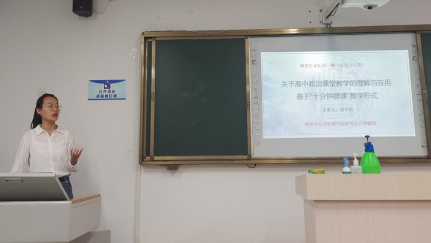 由我院研究生會(huì)理論部承辦的第三期研究生論壇(總第十九期)于4月25日19:00在6號(hào)教學(xué)樓C205舉辦。本次論壇主題為“關(guān)于高中政治課堂教學(xué)的理解與應(yīng)用——基于‘十分鐘微課’教學(xué)形式”,主講人是2020級(jí)政治學(xué)專業(yè)研究生榮小語(yǔ)。